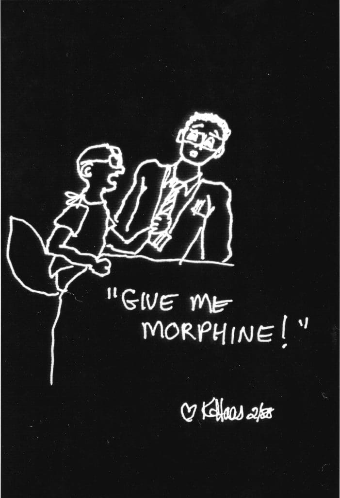 “Give me morphine!” It comes out an excruciating rasp.