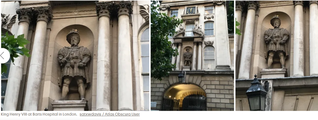 *The West Gate of St. Bartholomew’s Hospital (often called Barts) is officially known as the Henry VIII Gatehouse, which dates from 1702 and features the only public statue of King Henry VIII in London. It is located on West Smithfield.