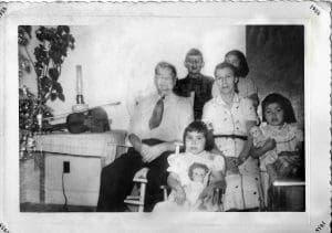 Mary Freda Paul (Simmons) in front holding the doll.  Back row: John R. Prosper and Patricia Paul Bernard; Phyllis Paul beside Mathilde, now Mrs. John Noel Prosper. Photo courtesy of John R. Prosper, Family Album. Restoration: Anne Louise MacDonald.