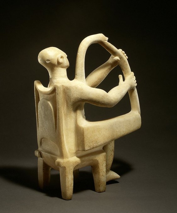 From 4,700 years ago comes this sophisticated, slightly abstract marble sculpture of seated man playing harp, & maybe singing. It was originally painted, & is one of the earliest-known depictions of musicians (Cyclades Islands).  In The Met Museum, New York City.