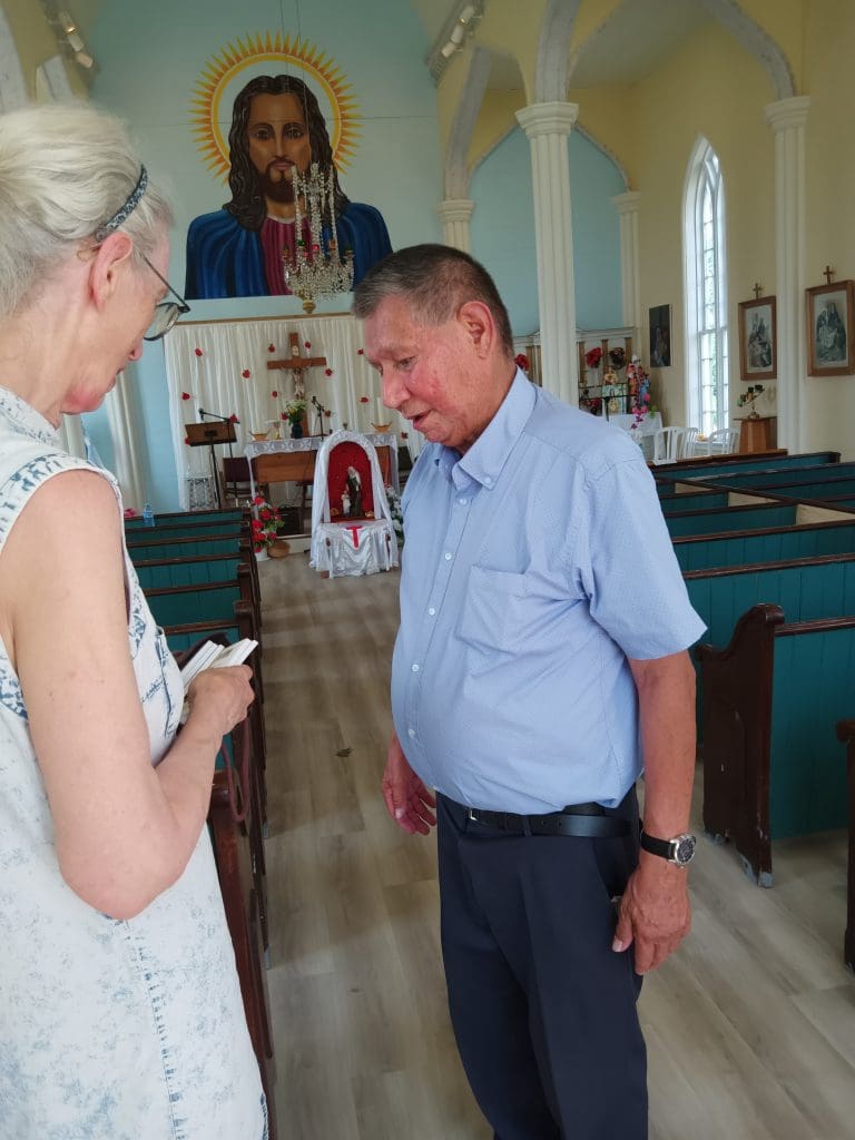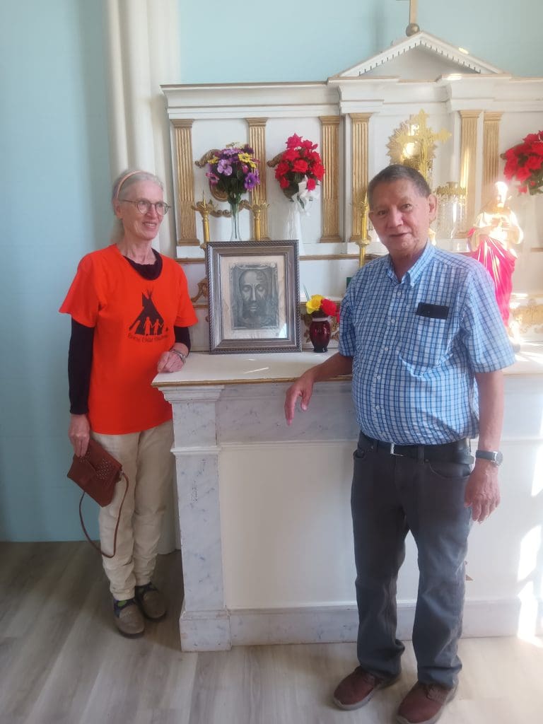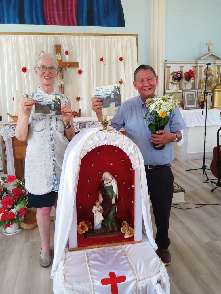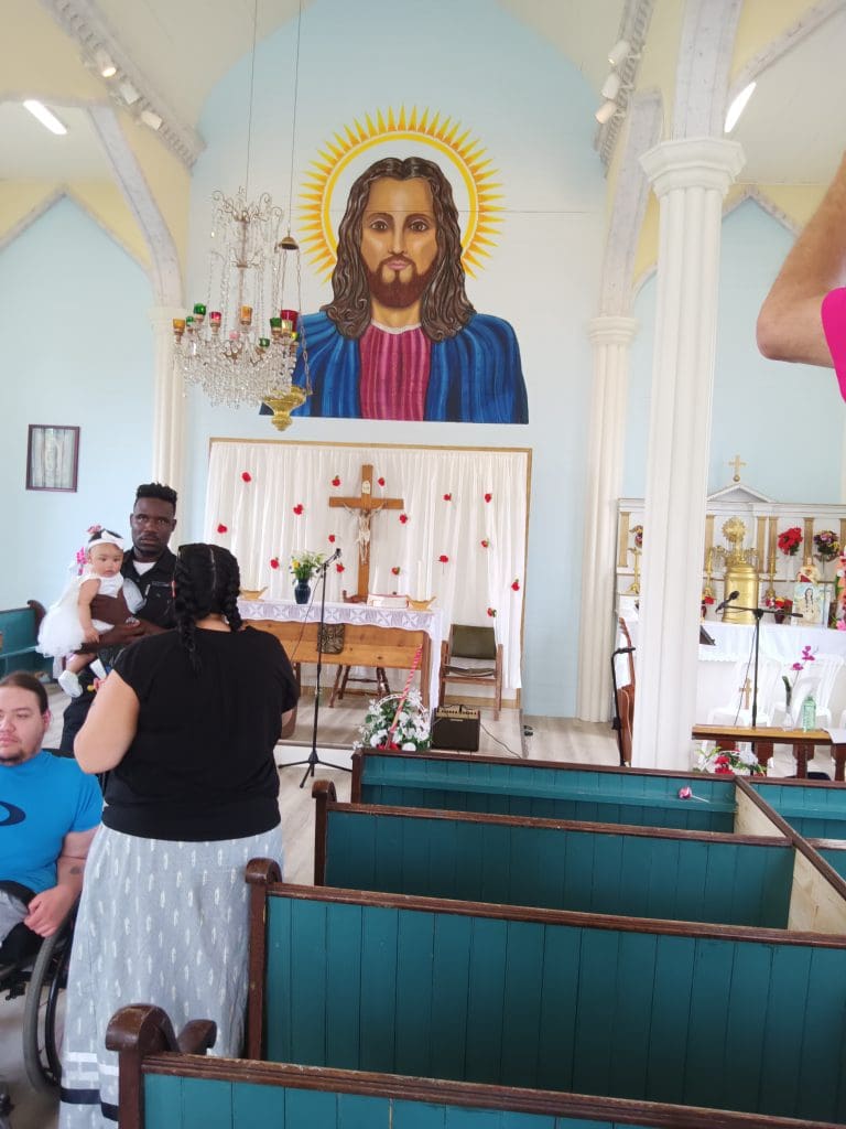 By the Feast Day of St. Anne 2023 the ceiling leaks had been repaired, the pews painted and reinforced and the painted image over the altar reworked by Andrew Murray to represent Jesus as a Middle East Jew. The bell rang out to call people to Mass, which was held inside St. Anne’s Church on July 26, 2023 for the first time in many years – and a baptism!