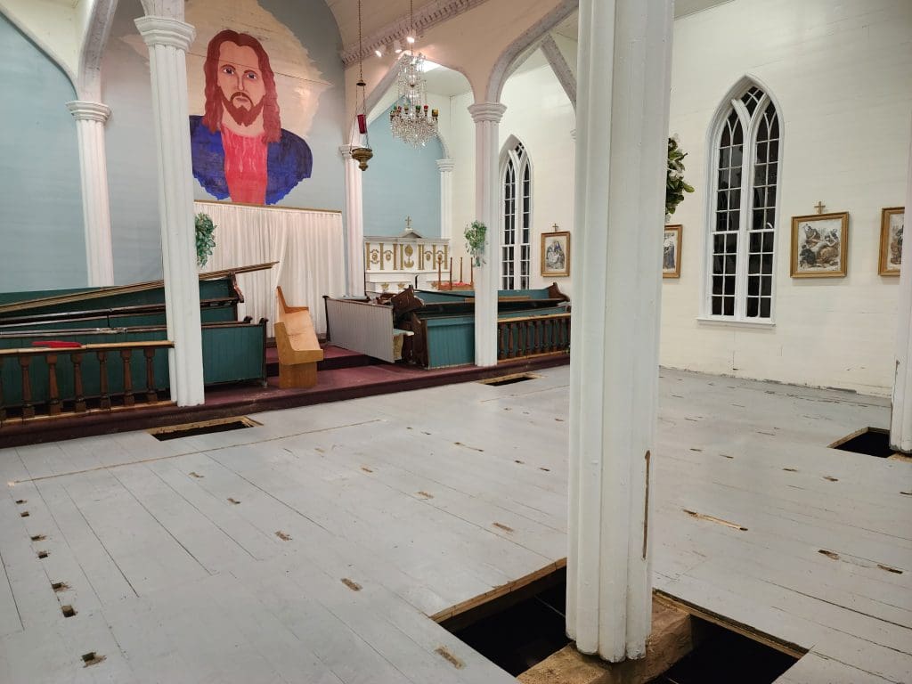 The pigeons have been evacuated from the steeple, which was cleaned out and reinforced before Hurricane Fiona hit in October 2022. A year later in October 2023, the steeple had been repaired and now rises upright into the heavens. A new front door has been installed. New technologies enable the lowering of the chandelier and the incense holder during services.  But now funds are running out and there is so much more to do. The windows have to be replaced before installing vinyl siding and the the existing shingles must be replaced with a steel roof.